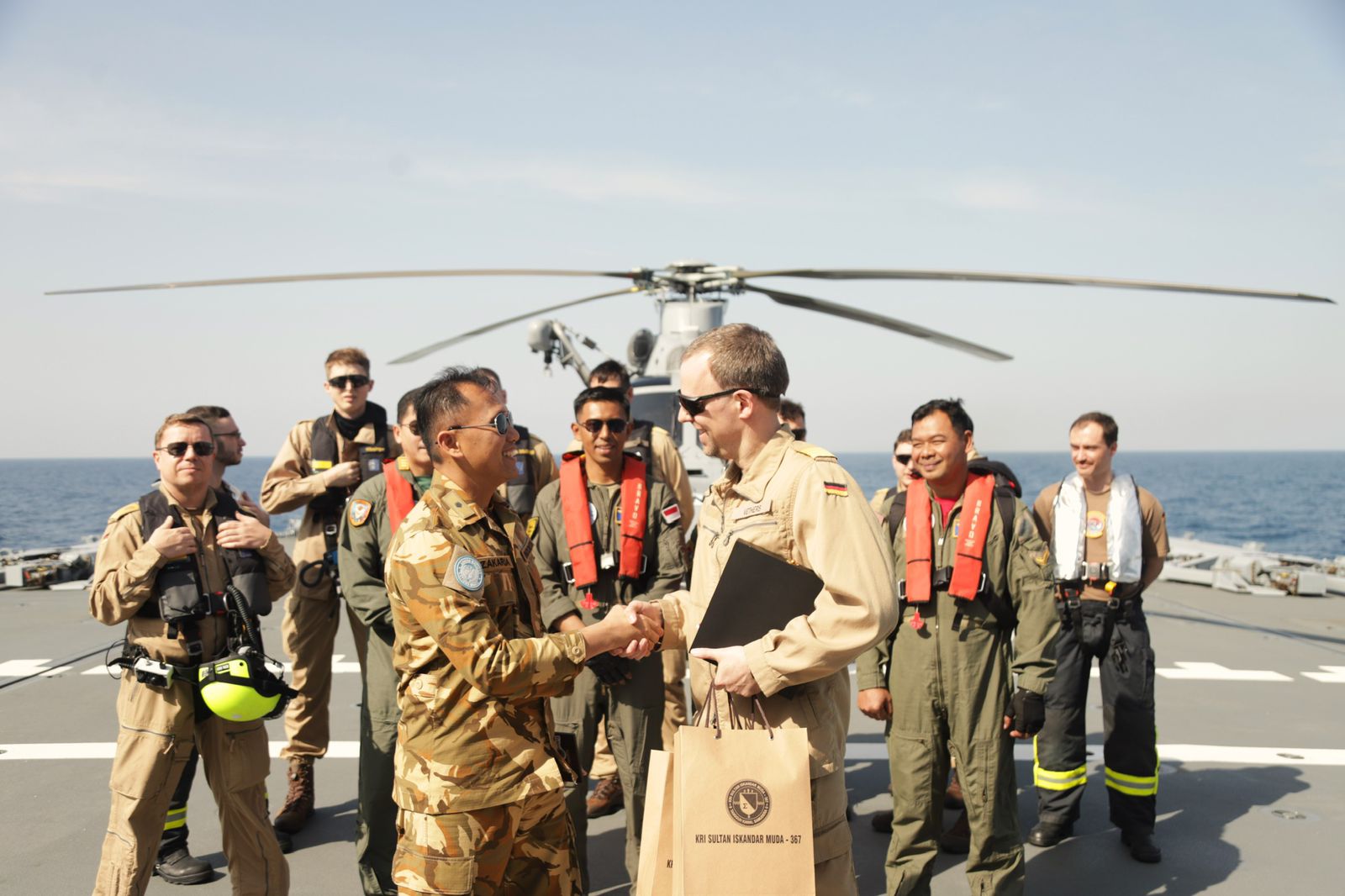 Heli AS 565 MBe Panther HS-1306 dalam latihan ini diawaki oleh Capt Pilot Kapten Laut (P) Agustinus Paath dan Copilot Lettu Laut (P/W) Andi Q. Wetuffahati, serta turut onboard Wadansatgas MTF XXVIII-P/UNIFIL Mayor Laut (P) Zakaria A. Rijal. Setibanya di kapal perang Jerman, mereka disambut langsung oleh Executive Officer (XO) FGS BWG F-222 LCDR Konstantin Vethers beserta kru kapal.