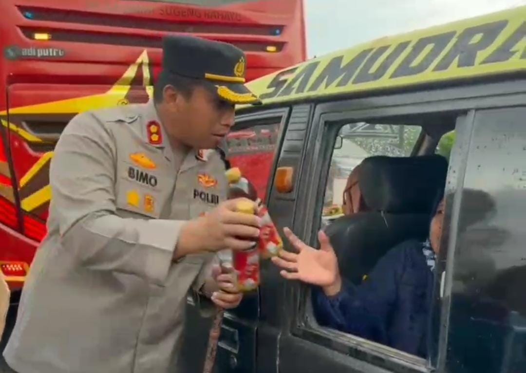 “Ya, selain membagikan air mineral kami juga mengingatkan kepada pengguna jalan untuk selalu berhati-hati di jalan dan mematuhi aturan lalu lintas, mengingat pada lebaran arus lalu lintas pengendara banyak yang melintas,” jelas AKBP Bimo.