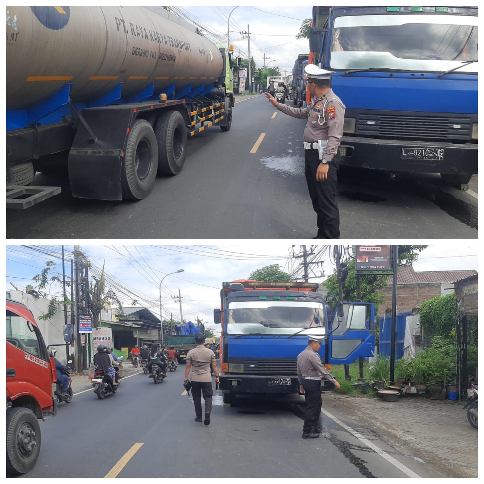 Gerak Cepat Kanit Lantas Polsek Menganti Atur Jalan Akibat Truk Bermuatan Ban Kempes