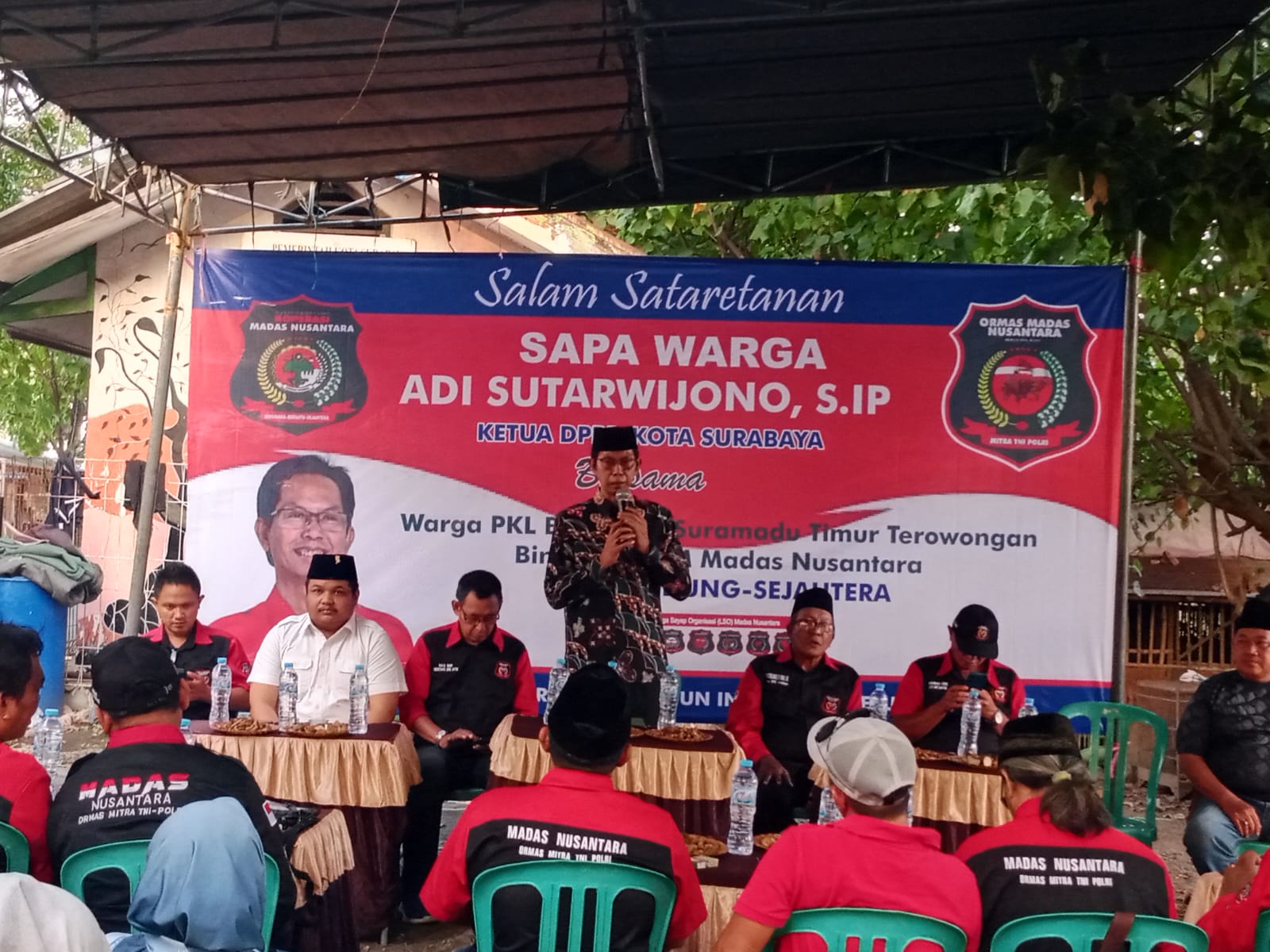” saya berterima kasih kepada Ormas Madas Nusantara Surabaya yang telah merangkul kelompok PKL masuk dalam pembinaan di koperasi UMKM nya untuk terus mengembangkan usaha memajukan ekonomi mereka , juga berpesan kepada ketua pkl selalu perketat pengawasan lingkungan agar selalu mematuhi aturan aturan yang ada jika terbukti kalian melanggar kami tidak bisa berbuat apa apa bila di tertibkan oleh satpol PP ketahuan ada bukti melanggar, tutur Adi Sutarwijono,SIP,