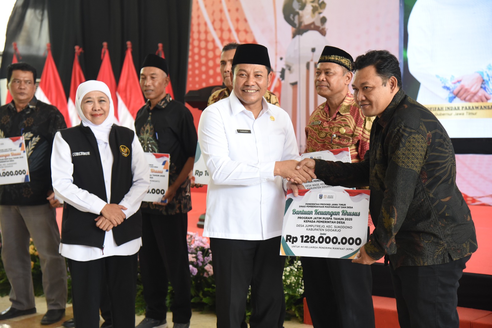 Ribuan masyarakat Sidoarjo menerima beragam bantuan sosial (bansos) dari Pemprov Jatim dengan total nilai mencapai Rp 4.914.099.600. Penyerahan secara simbolis dilakukan oleh Gubernur Jawa Timur, Khofifah Indar Parawansa, bersama Bupati Sidoarjo, Subandi, di Pendapa Delta Wibawa Sidoarjo, Jumat (22/8/2025).