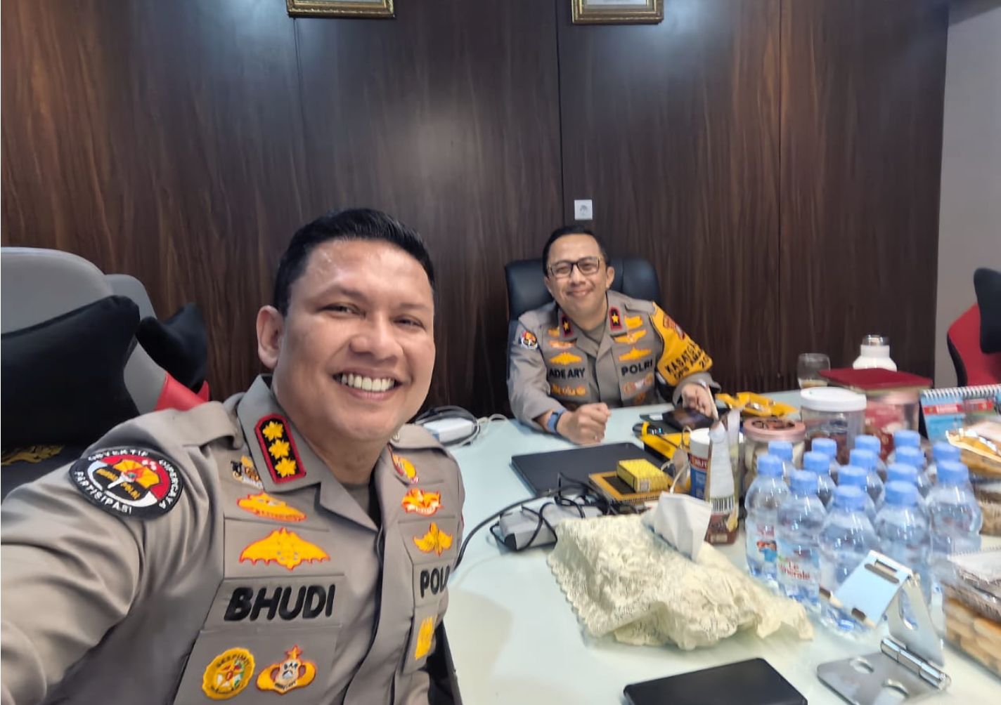Nampak di dalam ruangan tersebut Kombes Pol Budi Hermanto yang baru mau menjabat terlihat belajar ‘Menimba Ilmu’ kepada Brigjen Pol Ade Ary Syam Indradi.