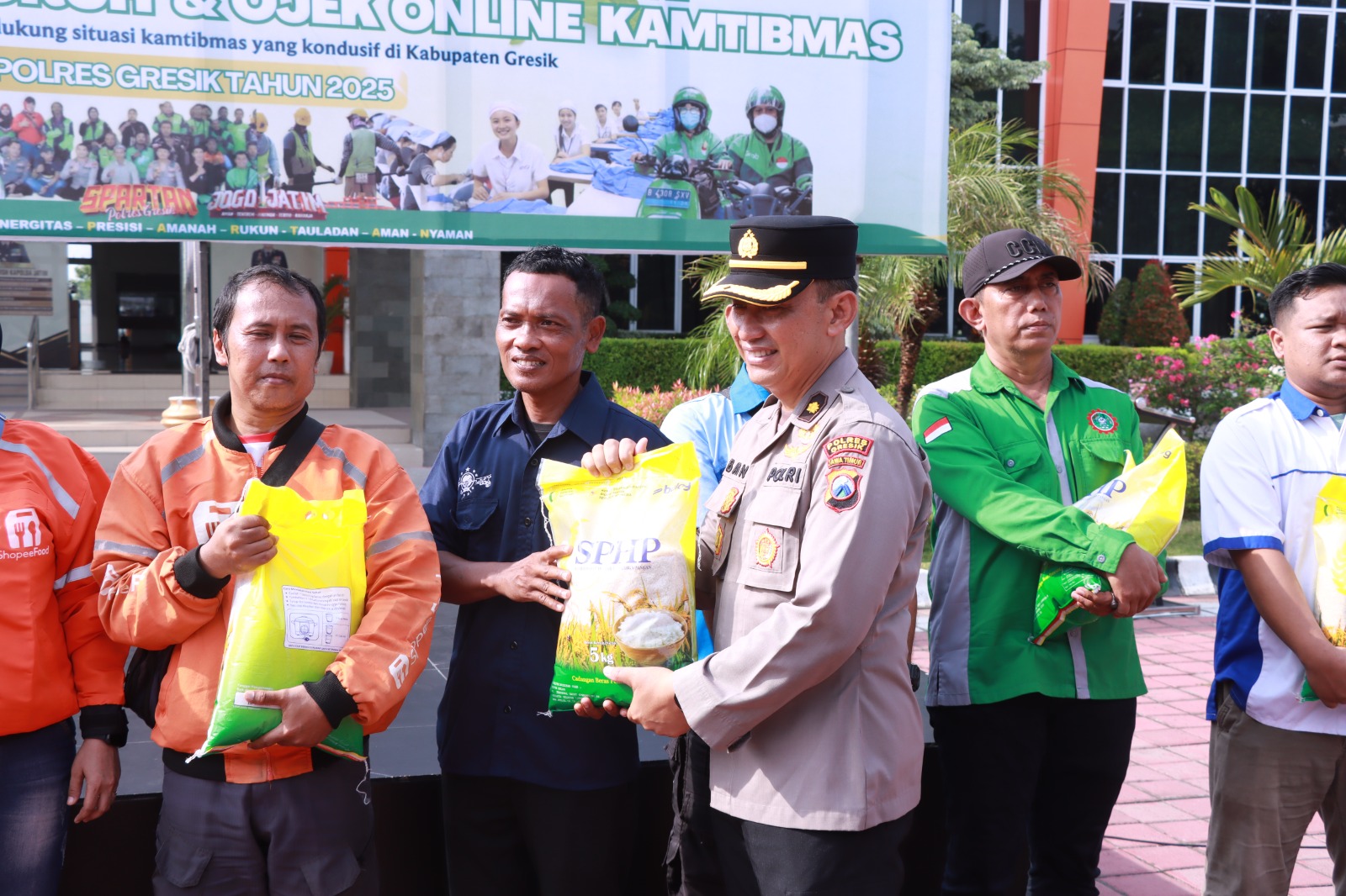 Kegiatan Apel Kebangsaan ini ditutup dengan penyerahan simbolis Beras SPHP kepada perwakilan Serikat SP/SB dan komunitas ojek online Gresik, sebagai bentuk apresiasi dan kepedulian sosial Polres Gresik. Momen kemudian dilanjutkan dengan sesi foto bersama dan sarapan kebangsaan, yang memperlihatkan keakraban antara aparat kepolisian dan masyarakat.
