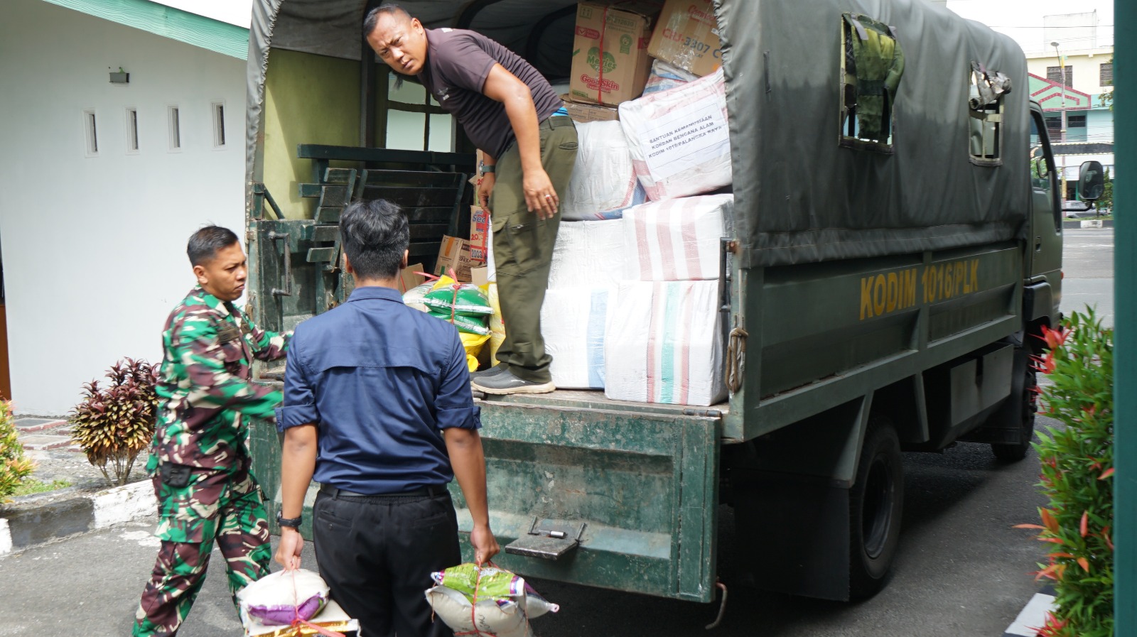 Dandim 1016/ Palangka Raya, Letnan Kolonel Inf Kurniawan Agung Sancoyo, S.E.,M.Han. menyampaikan, sebelum diberangkatkan ke lokasi bencana, bantuan logistik yang dikumpulkan dari Anggota Kodim beserta Masyarakat Binaan dipusatkan di Makodim 1016/Palangka Raya.