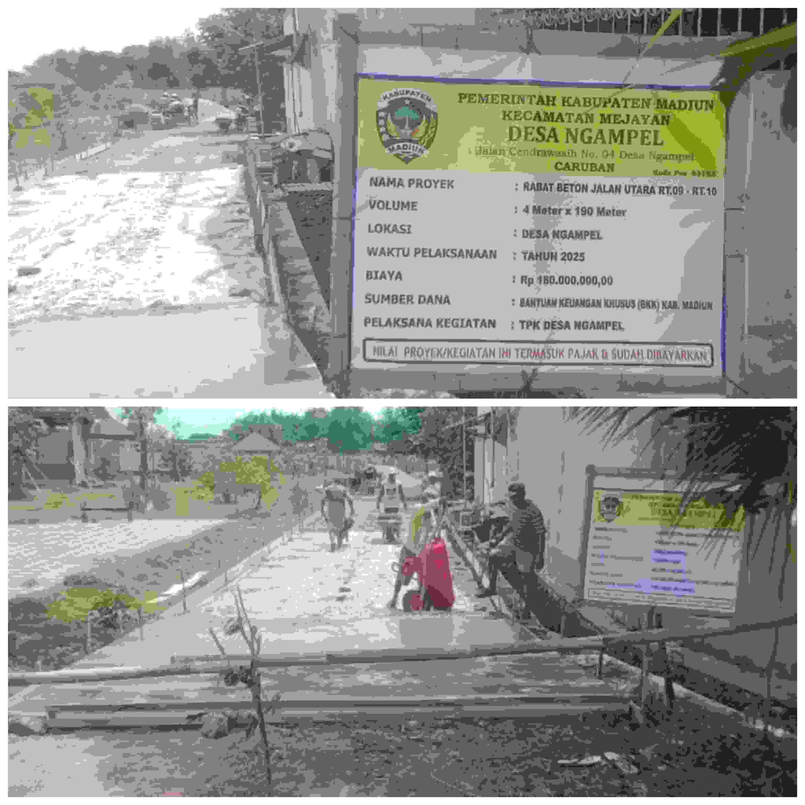 Pembangunan rabat beton tersebut berlokasi di Jalan Utara RT 09–RT 10 Desa Ngampel, dengan volume pekerjaan sepanjang 190 meter dan lebar 4 meter. Kegiatan ini dilaksanakan pada tahun anggaran 2025 dengan total anggaran sebesar Rp 180.000.000, yang bersumber dari Dana BKK Kabupaten Madiun.