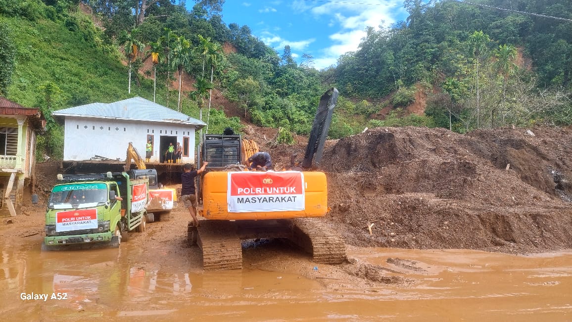 Sementara itu, di Sumatera Barat, Polri mengerahkan 12 unit alat berat dan 10 unit dump truck di Kabupaten Padang Pariaman, Agam, dan Pasaman Barat. Alat berat difokuskan untuk membuka kembali akses nagari dan korong, membersihkan pemukiman dan fasilitas layanan publik, serta memastikan jalur distribusi logistik masyarakat dapat kembali berjalan. Upaya ini dilakukan secara berkelanjutan seiring masih ditemukannya lumpur tebal dan material banjir di sejumlah titik.