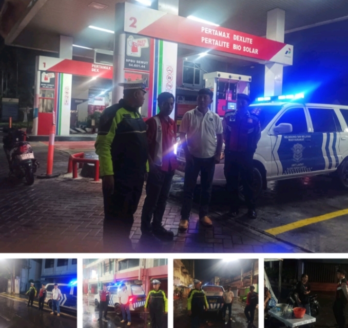 Sekitar pukul 22.30 WIB, patroli dialogis dilakukan di kawasan SPBU Jalan Stasiun Kota. Dalam kondisi hujan deras, petugas tetap melakukan pemantauan serta menyampaikan imbauan kamtibmas kepada masyarakat yang masih beraktivitas malam hari.