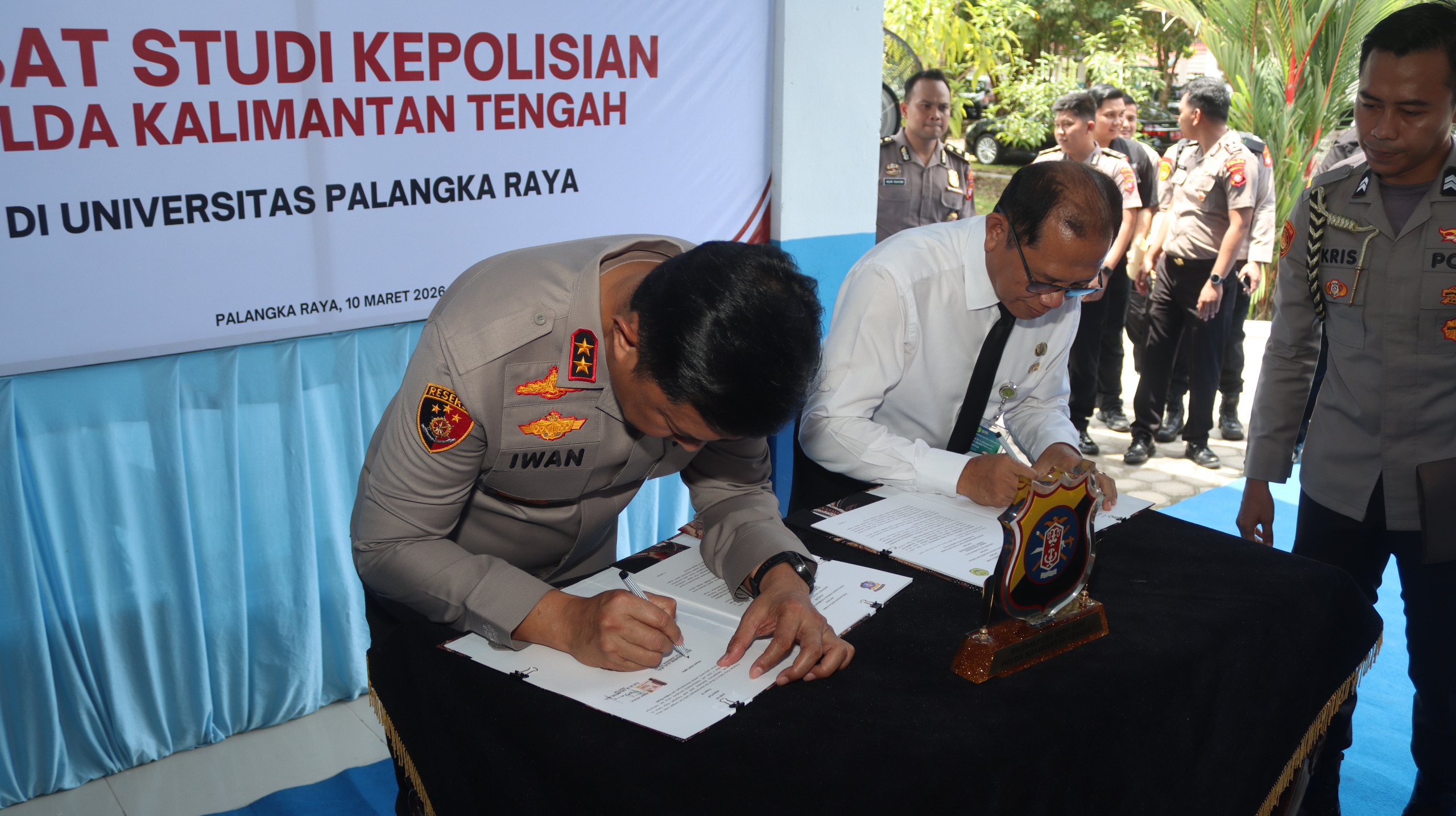 Kerjasama ini ditandai dengan penandatanganan perjanjian kerjasama dan peresmian Pusat Studi Kepolisian yang akan melakukan penelitian dan kajian terkait masalah kepolisian, di Gedung LPPM UPR, Selasa (10/3/2026) siang.