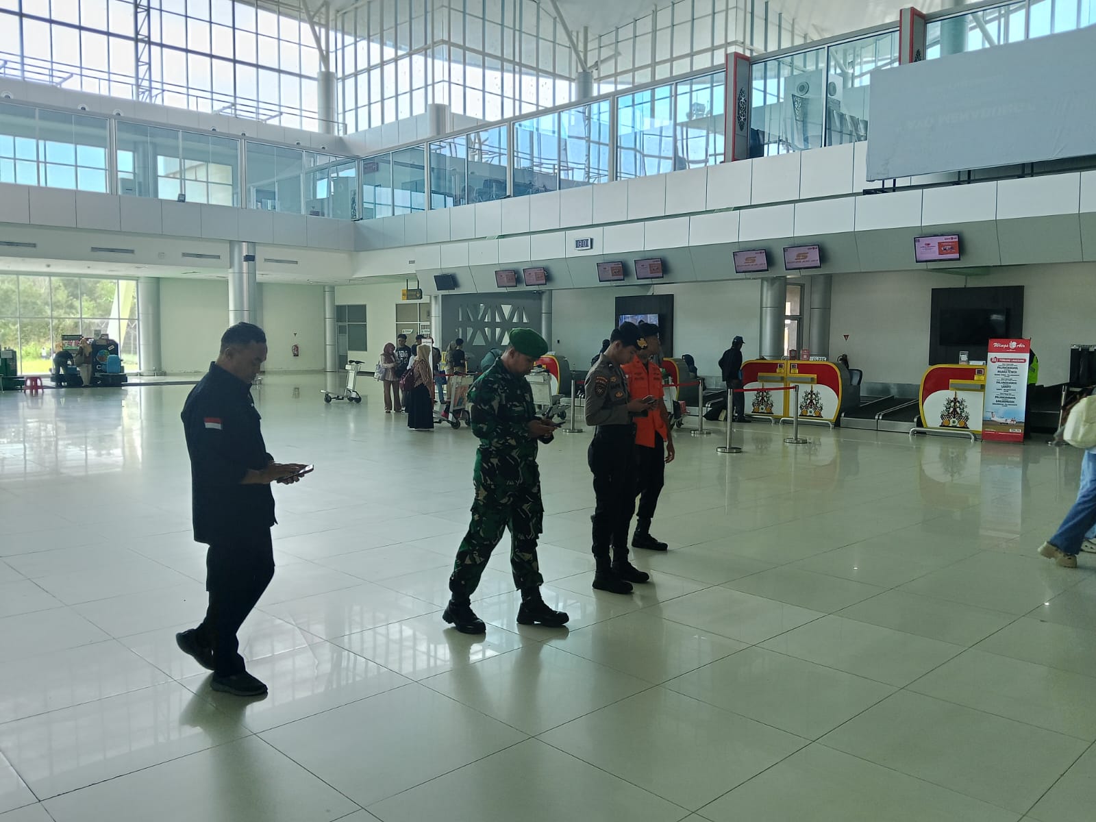 Kegiatan pengamanan tersebut dilaksanakan dengan menempatkan personel di sejumlah titik strategis bandara guna memastikan aktivitas penumpang serta operasional penerbangan berjalan aman dan tertib.